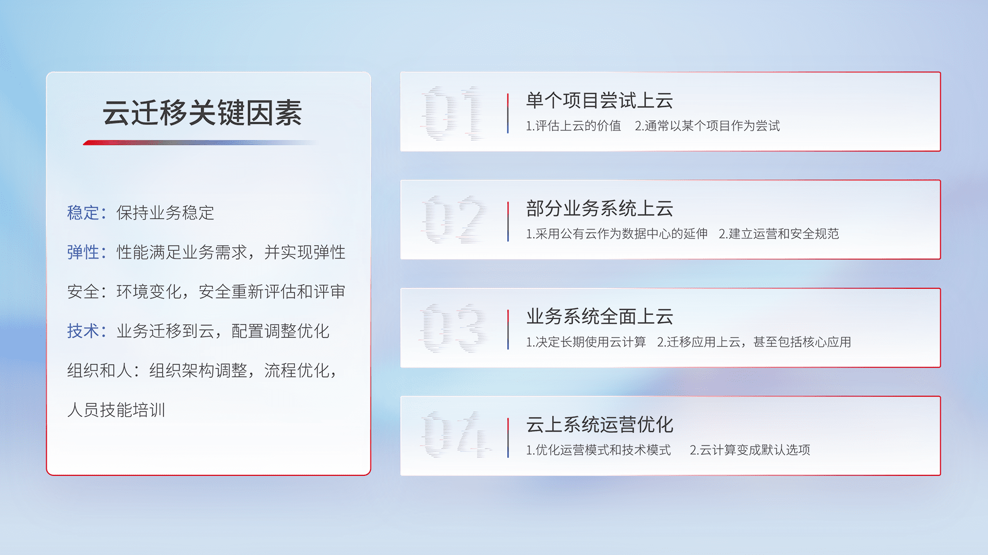 结合实际业务,,,从规划设计、、、云平台选型、、、、云原生改造、、、、数据迁移、、集成交付,,,迁移全过程为客户识别最佳上云路径,,,,做好风险识别管理,,,,设计网络架构、、、身份权限、、、、安全审计合规、、操作审计、、、、日志审计、、、监控告警策略、、多站点容灾设计等,,,,对云上基础设施进行整体规划,,提升IT治理水平,,,,以满足弹性、、、、高可用、、、高性能的需求。。。