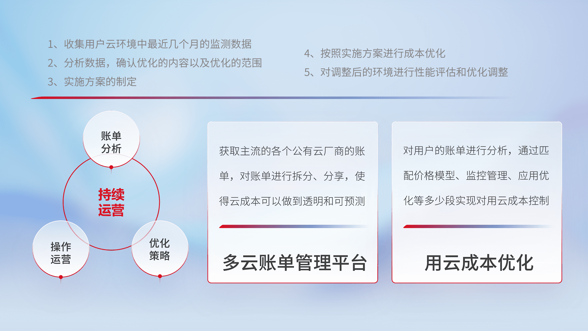 通过多云纳管,,,,以统一的资源数据模型把客户的云资源进行抽象和封装,,,,进而实现对多云资源的统一操作,,,,保障云资源管理的可靠性、、、稳定性与可用性。。。。量身定制化运维内容,,配置、、、、开发运维、、、、补丁管理、、、备份、、、、监控、、认证和访问管理、、、审计和日常巡检等,,,,保障在用云过程中的可靠度,,稳定度以及高可用率。。。